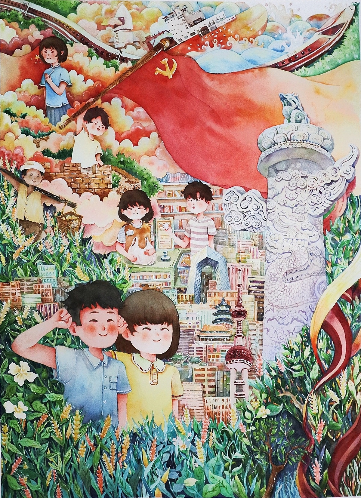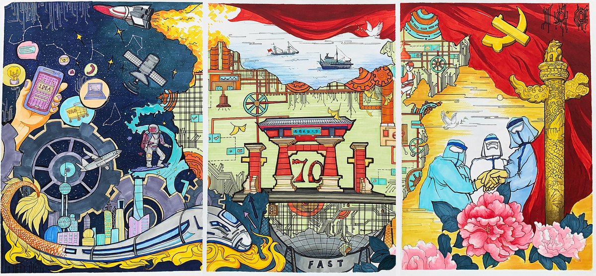 这些作品包括了版绘、油画、连环海报、系列彩绘、书法作品等。有的通过文字致敬中国青年,有的通过画笔表达爱国之情,有的用系列主图歌颂美好的新时代。