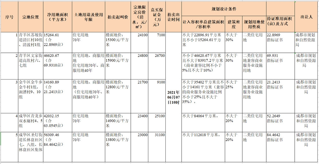 作为此次集中出让拍卖首日,6月7日当天将有10宗主城区住宅用地走上拍卖席,包括成华区3宗,金牛区2宗,武侯区2宗,青羊区2宗,锦江区1宗。总面积约430亩,起拍总价约80.27亿元。