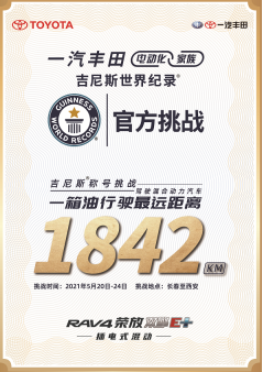 此外,为期四天的一汽丰田电动化家族挑战吉尼斯世界纪录,从一汽丰田长春工厂出发,跨越吉林、辽宁、河北、天津、北京、河南、陕西7大省市,最终到达西安,征服城市道路、高速道路等各种复杂路况,展现出强大的产品力;最终,以“一箱油行驶最远距离1842KM”,获得吉尼斯认证成绩。