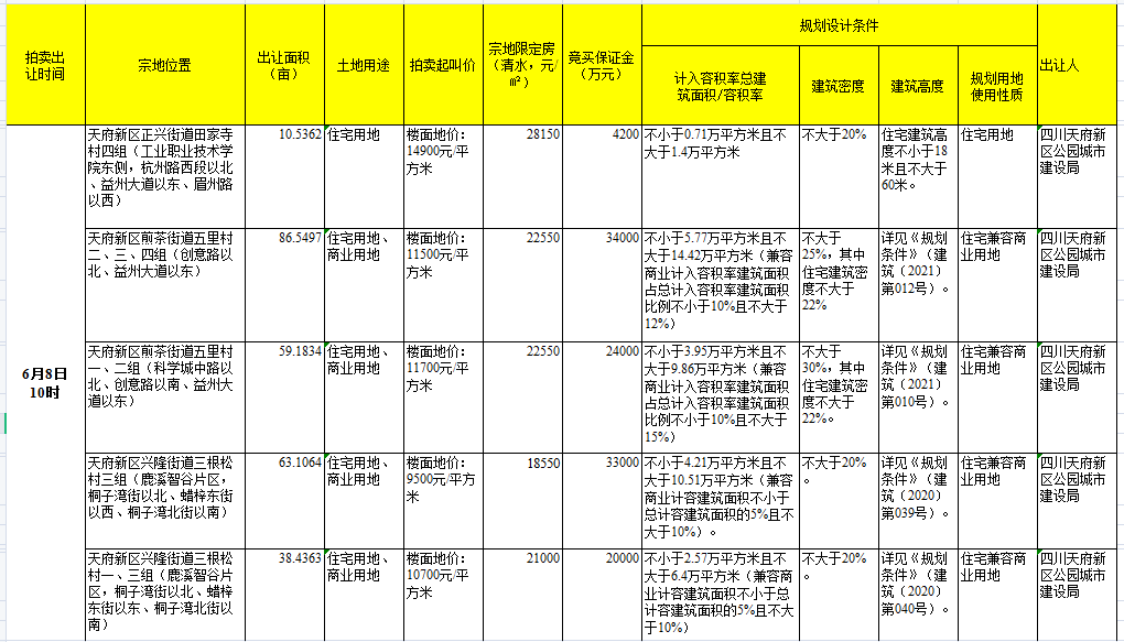 6月8日上午,又将有来自天府新区5宗共计约257亩土地将走上拍卖台,分别位于正兴街道、煎茶和兴隆湖。其中煎茶街道的两宗地块分别为86亩和59亩,起拍楼面地价为11000元/平米左右,清水限房定价位22550元/㎡。兴隆湖两宗地的清水限房分别为18550元/㎡和21000元/㎡,与周边二手房房价剪刀差明显,预计将引发开发商追捧,四川在线将持续关注。