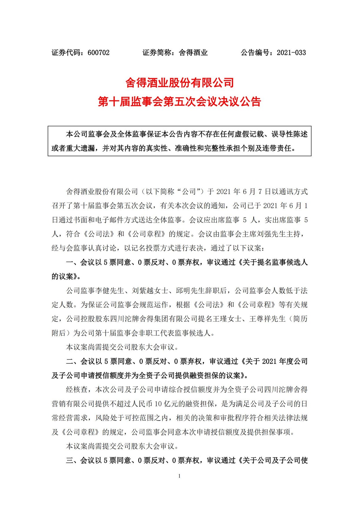 今日(6月7日)晚间,川酒六朵金花之一的舍得酒业发布公告称,控股股东沱牌舍得集团提名黄震、吴毅飞、郝毓鸣、邹超担任第十届董事会董事候选人,王瑾、王尊祥担任第十届监事会非职工代表监事候选人。同时,公告还称,将于6月29日召开年度股东大会,审议董监事提名等议案。