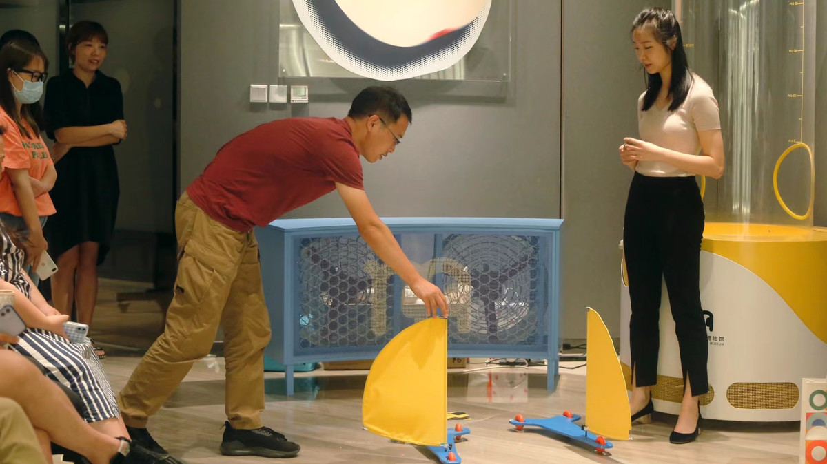 在现场,个别趣味物理挑战小游戏抢先“曝光”。例如,风帆船利用风力制造动力,由于风作用于帆的力的两种不同形式,风帆船既可以顺风前行,也可以逆风行驶。