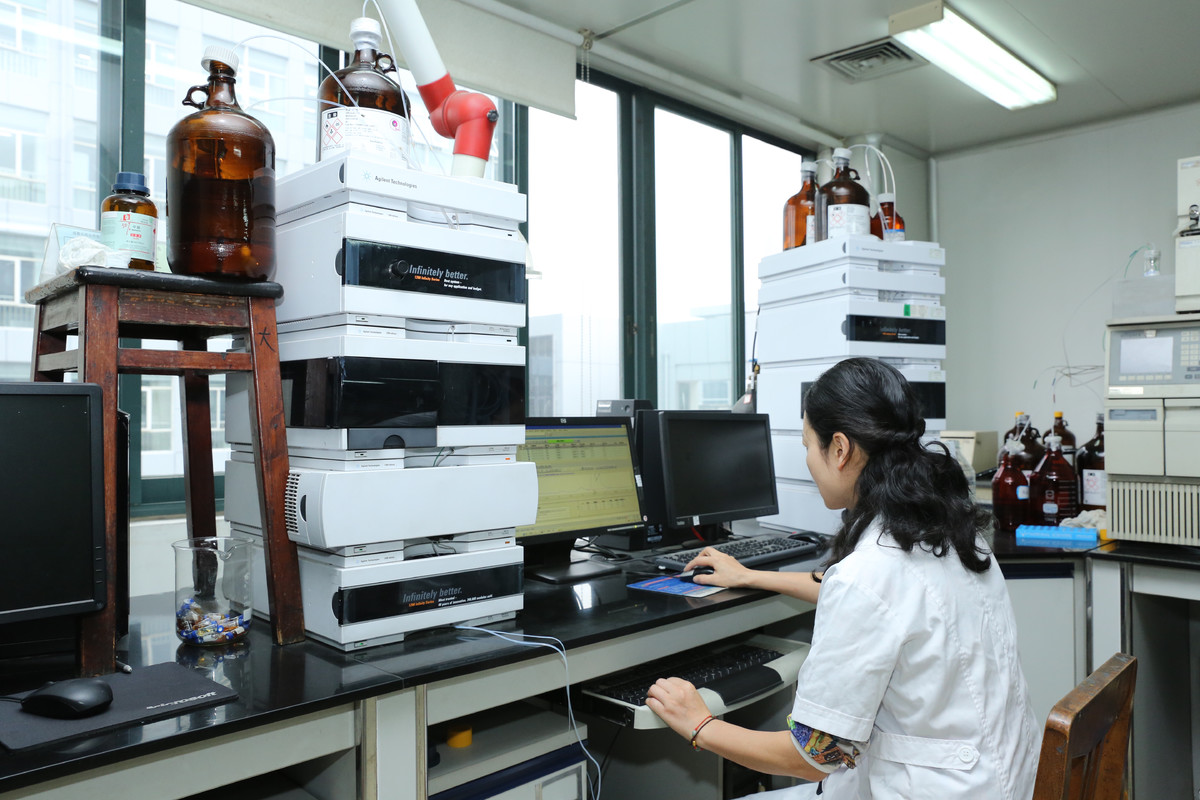 中药材质量监测评价重点实验室工作人员正在进行中药材高效液相解析