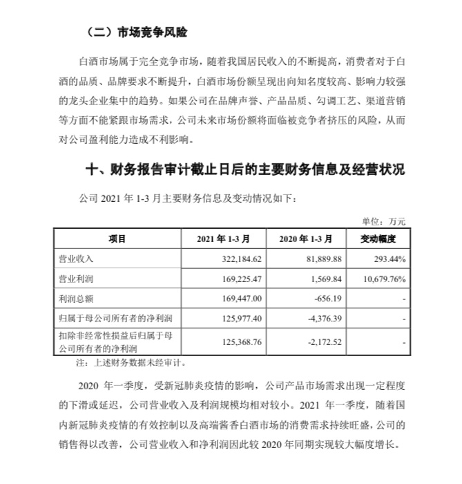 同时,招股书还显示,2021年1-3月,郎酒营业收入32.22亿元,同比去年增长293.44%;营业利润16.92亿,同比去年大幅增长10679.76%;利润总额16.94亿元,归属于母公司所有者的净利润12.60亿。