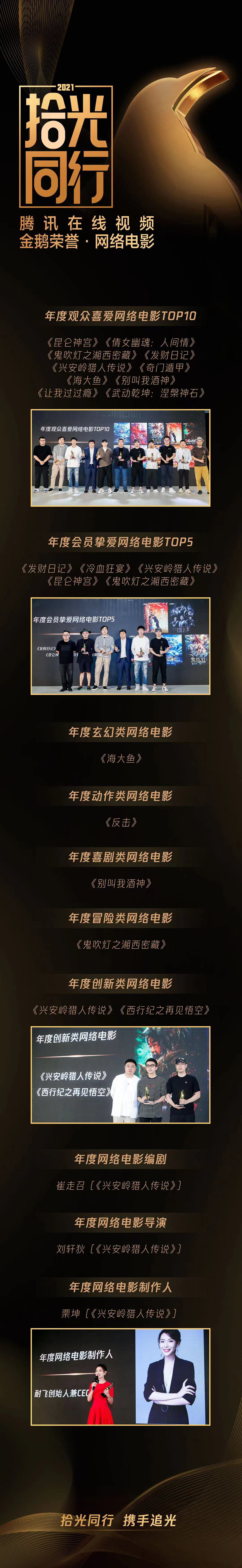 与《兴安岭猎人传说》共同获得“年度创新类网络电影”的还有国漫IP开发《西行纪之再见悟空》;创造了网络电影行业分账票房纪录的《鬼吹灯之湘西密藏》获“年度冒险类网络电影”;以经典神话传说实现女性题材突破的《海大鱼》获“年度玄幻类网络电影”;爆款东北喜剧作品《别叫我酒神》获得“年度喜剧类网络电影”;塑造跌宕起伏情节与硬核动作场面的军事枪战题材作品《反击》则收获“年度动作类网络电影”。