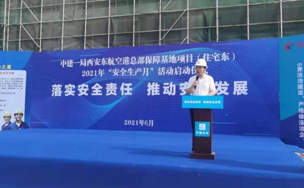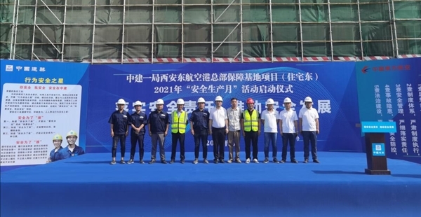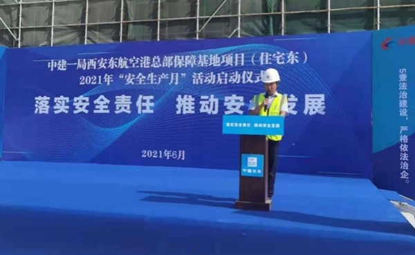 为响应全国第20个“安全生产月”活动号召,深入贯彻落实习近平总书记关于安全生产重要论述,扎实推进安全生产专项整治三年行动集中攻坚,提高全体员工的安全生产意识,牢固树立安全发展理念,6月7日,中建一局西安东航空港总部保障基地项目以“落实安全责任,推动安全发展”为主题,组织开展2021年“安全生产月”启动仪式。仪式由西安东航空港总部保障基地(住宅东)项目安全总监刘光雨主持, 西安东航空港总部保障基地(住宅东)项目经理关宗耀作动员讲话,西安镐睿置业有限公司党支部书记龙雪波出席并致辞,此次活动包括业主、总包、监理、劳务单位共计150余人参加。