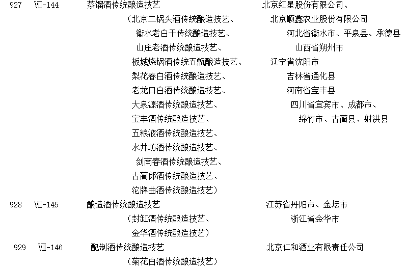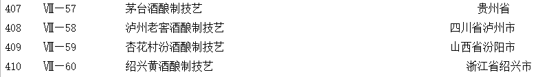 国务院于2006年5月20日发布的《国务院关于公布第一批国家级非物质文化遗产名录的通知》和2008年6月7日发布的《国务院关于公布第二批国家级非物质文化遗产名录和第一批国家级非物质文化遗产扩展项目名录的通知》显示,泸州老窖酒、五粮液酒、水井坊酒、剑南春酒、古蔺郎酒、沱牌曲酒等川酒“六朵金花”酿造技艺皆先后成功入选,是白酒类国家级非遗入选最多的省份,占到了白酒类国家级非遗的一小半。