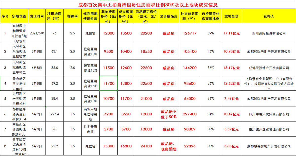 成都此次土地拍卖,采取“设置可售商品住房清水最高销售均价+设置土地最高限价+竞自持租赁住房面积比例”的拍卖形式。因此,此次土拍虽然楼面地价看起来很温和,溢价率没有创新高,但一些地块竞拍下来的自持租赁住房面积比例并不低。