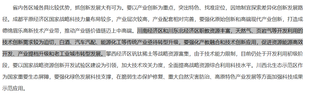 在《中共四川省委关于深入推进创新驱动引领高质量发展的决定》的说明第三部分强调,川南经济区和川东北经济区职教资源丰富,天然气、页岩气等开发利用的技术创新需求较为迫切,白酒、汽车汽配、能源化工等传统产业亟待转型升级,要强化产教融合和技术创新应用,促进资源能源高效开发、产业提档升级和老工业城市转型发展。