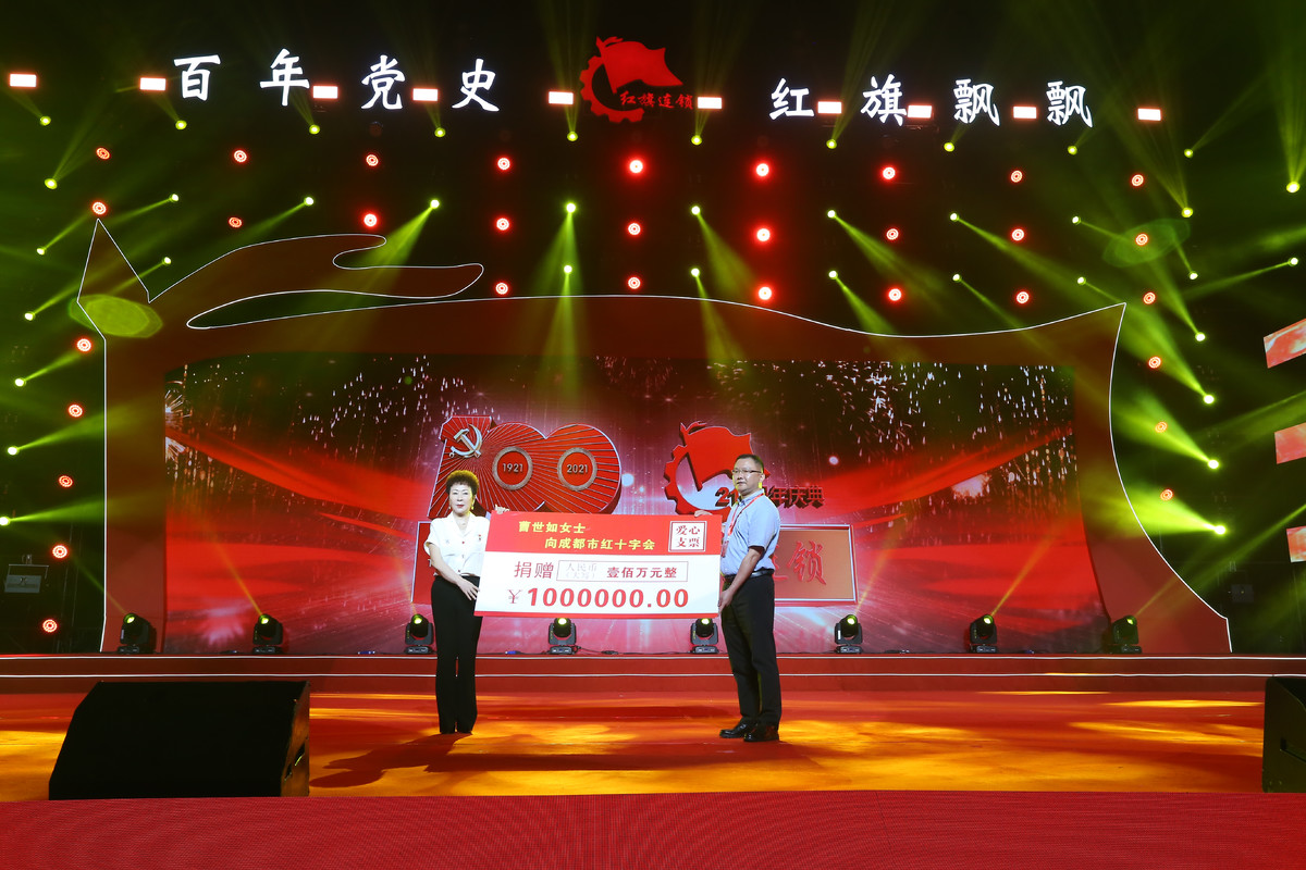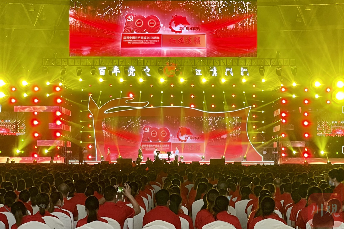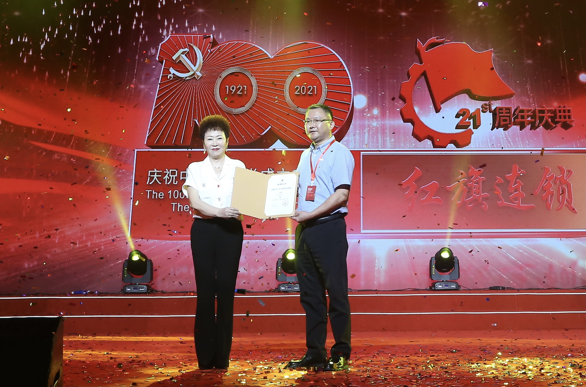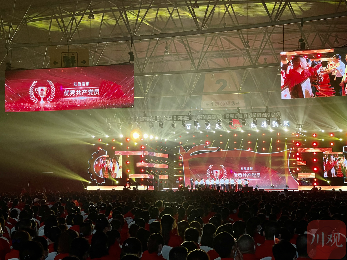 6月24日,成都世纪城新会展中心2号馆内红旗飘扬、歌声回荡,红旗连锁举行庆祝中国共产党成立100周年暨红旗连锁21周年颁奖活动。