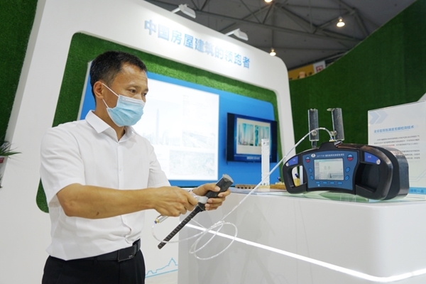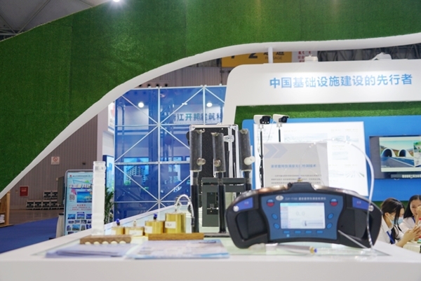 在中建一局的展台上,不仅展示了包括AI智能识别、VR安全教育等智慧建造设备,还带来了他们自主研发的、目前市场上唯一一台能够定量检测装配式建筑灌浆套筒饱满度的产品。