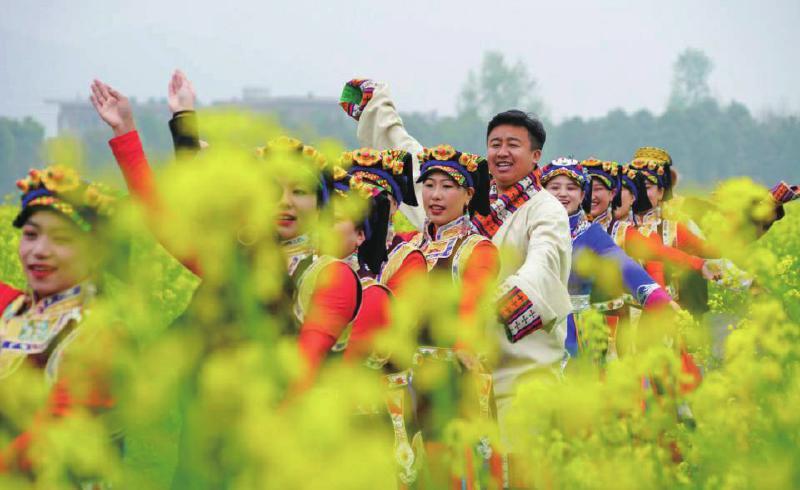 马尔康嘉绒锅庄跳进崇州油菜花海。 (马尔康市委宣传部供图)