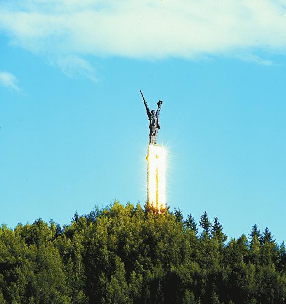 这是被誉为“中华第一金碑”的红军长征纪念碑——碑身为亚金铜贴面的三角立柱体,碑顶一位红军战士双手高举,一手持花,一手持枪,寓意红军长征的胜利。