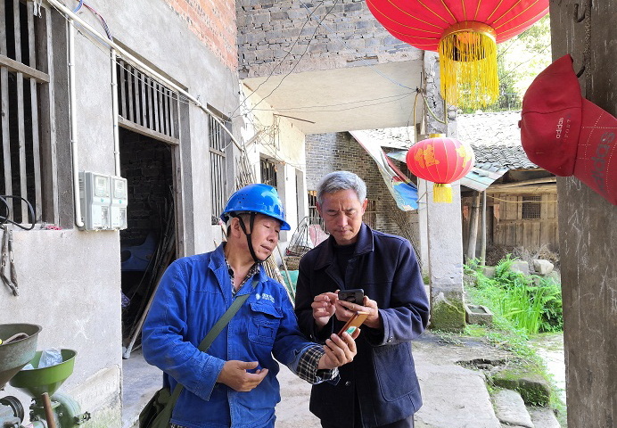 “电联万家”行动中,电力工人为农村用户推广手机APP充费便民措施。