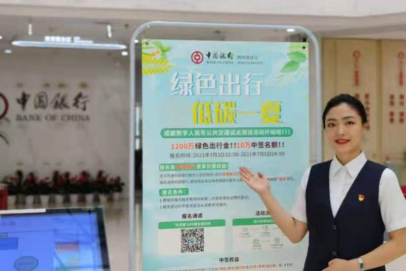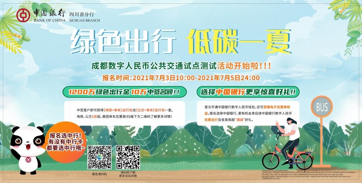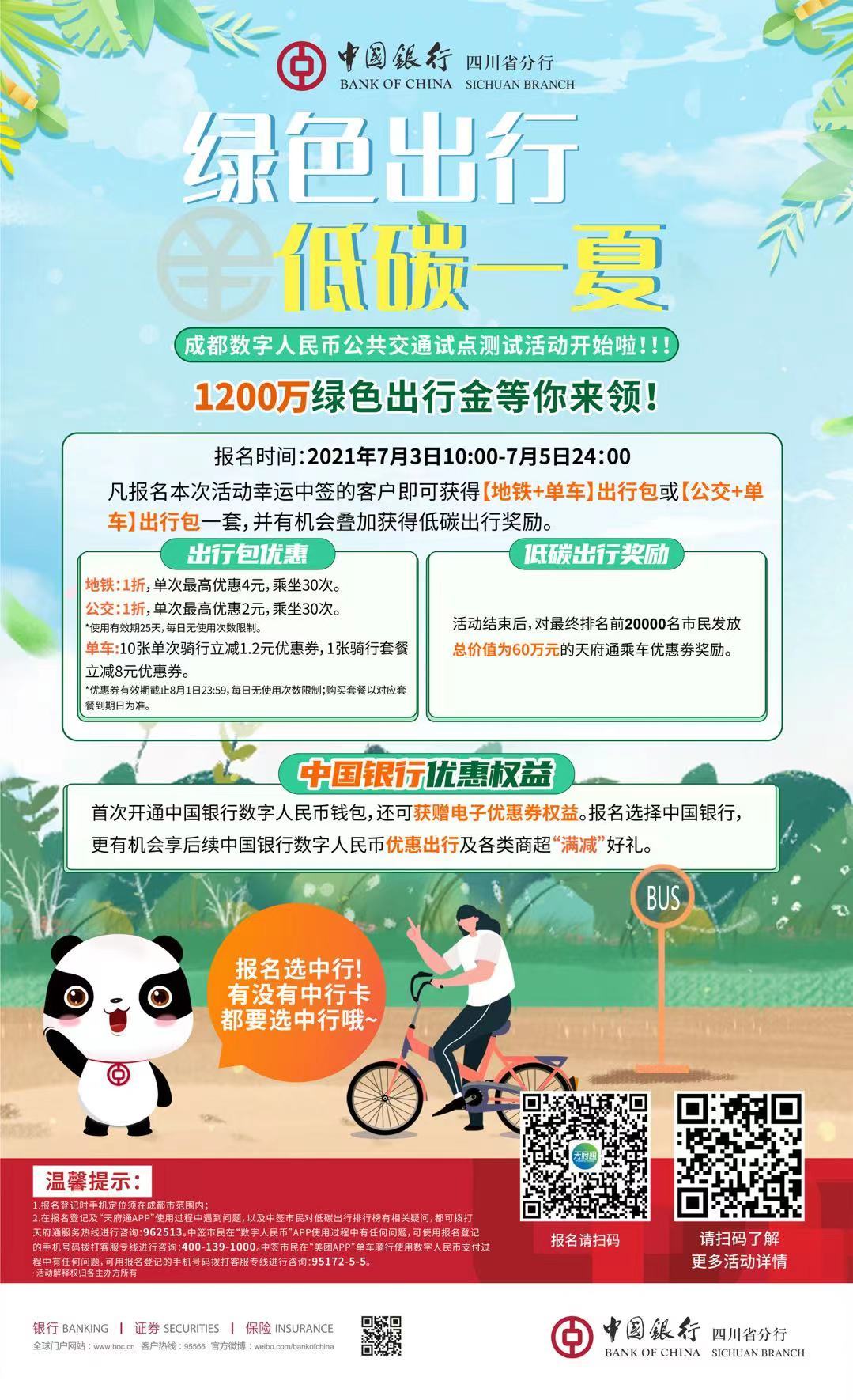 由成都市政府、中国人民银行成都分行联合主办的“绿色出行·低碳一夏”成都数字人民币公共交通试点测试活动于7月3日正式开启报名,面向成都市民发放总金额为1200万元的数字人民币绿色出行礼包,礼包数量共计10万份,中签市民可获得“地铁+单车”或“公交+单车”优惠权益。