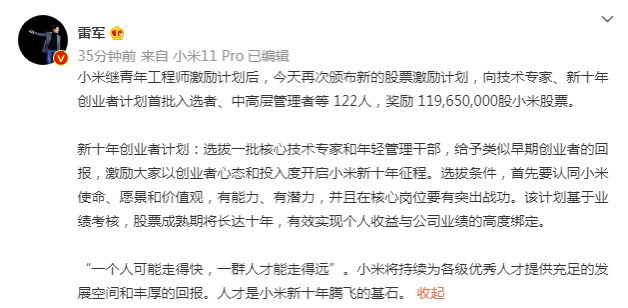 其中新十年创业者计划,选拔一批核心技术专家和年轻管理干部,给予类似早期创业者的回报,激励他们以创业者心态和投入度开启小米新十年征程。