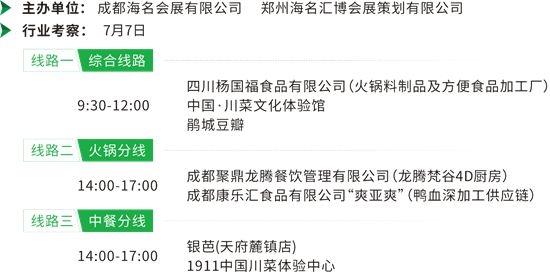 四川素有天府之国美誉,成都拥有世界美食之都称号。川菜发源于我国古代的巴国和蜀国,数千年来川菜依赖于得天独厚的自然条件经历了中国烹任各派交融,使得四川餐饮经济发达、产业成熟,川菜和川渝火锅在全国的市场占有率首屈一指,有赖于其背后供应链的成熟和稳定,四川拥有众多大型餐饮连锁企业和供应链企业、特色食材基地、餐饮名店/旺店、中央厨房、供应链工厂,成熟的产业加上创意的品牌运营思路,四川餐饮的发展和扩张在全国一骑绝尘,成为了餐饮人考察学习首选之地。值此展会开幕之际和全国餐饮人汇聚之时,海名会展继续联合全国餐饮行业协会组织各区域餐饮头牌企业赴四川进行川菜&火锅探秘之旅,重点考察川内品牌火锅川菜旺店、特色川菜企业、大型中央厨房、产业基地和优秀食材和调味品供应链企业、等不同业态,学习品牌企业成功经验、先进模式。