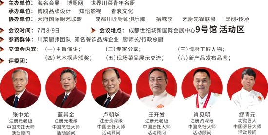 天府之都,美食云集,能工巧匠数不胜数,丰富和发展中国饮食文化,提升川菜美食竞争力、影响力,提高市场占有率,推动现代中餐烹饪技术之间的交流,促进餐饮工匠技能提升,定于2021年7月8日-9日在展会9号馆举办第五届千厨百城厨师交流会,艺术盘式大赛,以"提升川菜技艺能力、塑造川菜工匠人物"为主题,