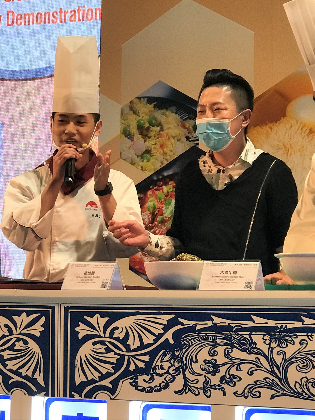 古柏宇在活动现场,向主持人介绍川菜厨艺,以及自己的学厨经历