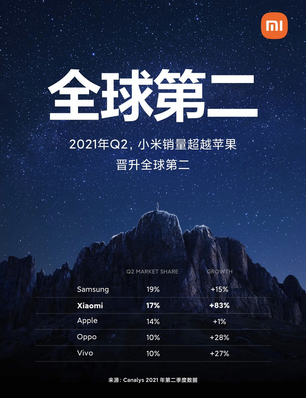 7月16日,全球著名市场调研机构Canalys发布手机市场第二季度排名,小米公司在全球智能手机市场占有率达到17%,超越苹果晋升全球第二,同比高速增长83%。