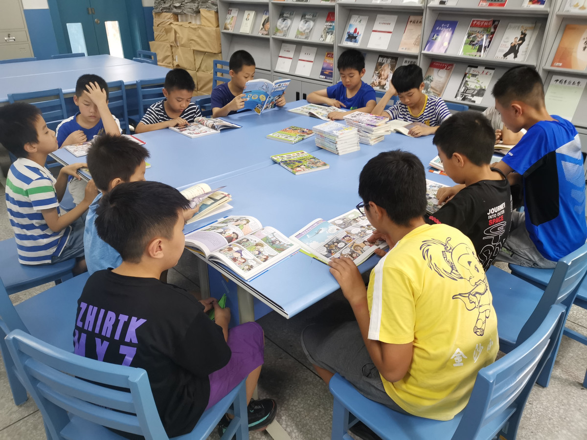 7月19日上午9时,成都市金沙小学已有20多名孩子到校,大家或围坐在圆桌周边,开心地翻阅经老师精选的几百册暑期读物;或是自己安静地做暑期作业,不懂的题目还有老师指导答疑。