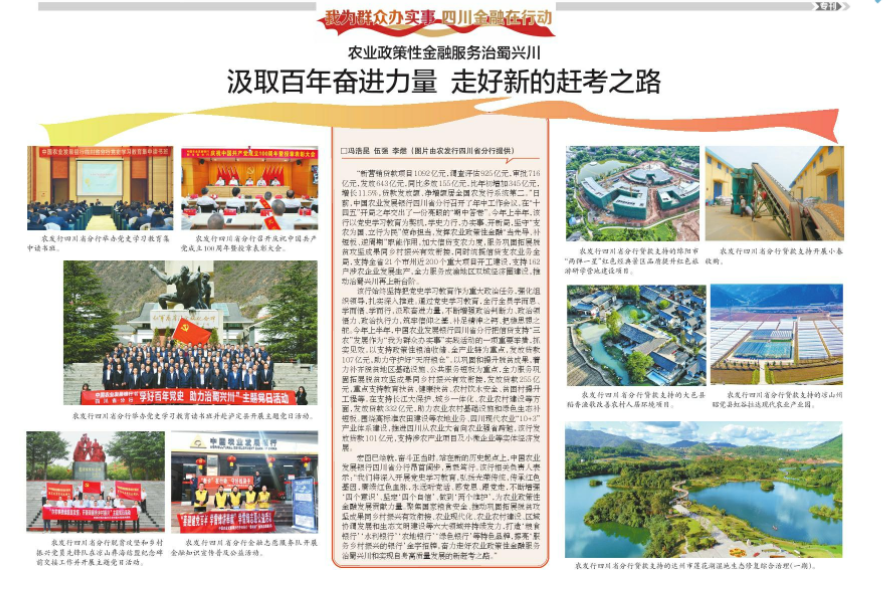 该行始终坚持把党史学习教育作为重大政治任务,强化组织领导,扎实深入推进。通过党史学习教育,全行全员学而思、学而悟、学而行,汲取奋进力量,不断增强政治判断力、政治领悟力、政治执行力,筑牢信仰之基、补足精神之钙、把稳思想之舵。今年上半年,中国农业发展银行四川省分行把信贷支持“三农”发展作为“我为群众办实事”实践活动的一项重要举措,抓实见效。以支持政策性粮油收储、全产业链为重点,发放贷款107亿元,助力守护好“天府粮仓”。以巩固和提升脱贫成果,着力补齐脱贫地区基础设施、公共服务短板为重点,全力服务巩固拓展脱贫攻坚成果同乡村振兴有效衔接,发放贷款255亿元,重点支持教育扶贫、健康扶贫、农村饮水安全、贫困村提升工程等。在支持长江大保护、城乡一体化、农业农村建设等方面,发放贷款332亿元,助力农业农村基础设施和绿色生态补短板。围绕高标准农田建设等农地业务、四川现代农业“10+3”产业体系建设,推进四川从农业大省向农业强省跨越,该行发放贷款101亿元,支持涉农产业项目及小微企业等实体经济发展。