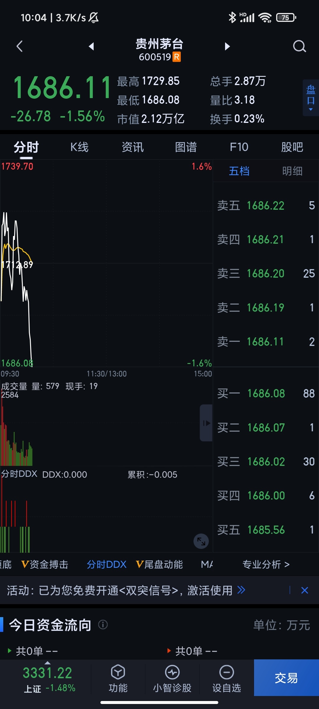 今日早盘贵州茅台经过短暂的抵抗后便一路下跌,10时02分失守1700元整数关口,最低下探1682.12元,半年内市值跌去了超1.13万亿。