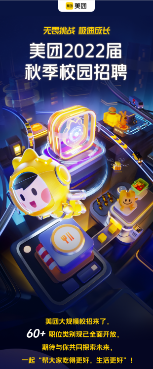 8月2日,美团宣布启动“美团2022届秋季校园招聘”,招聘对象为2021年11月-2022年10月期间毕业的海内外院校应届毕业生,招聘地点包括北京、上海、成都、深圳、厦门、广州、武汉、扬州、石家庄等数十个城市。