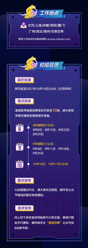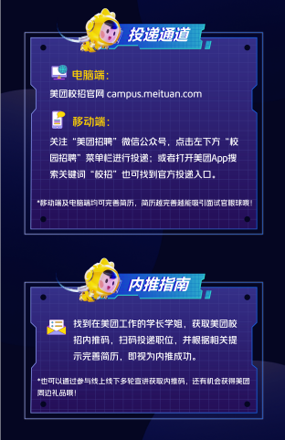 此次美团校招简历投递时间即日起至2021年10月14日24:00时止。投递方式通过电脑端登陆美团校招官网 campus.meituan.com进入招聘页面即可;移动端则是关注“美团招聘”微信公众号,进入“校园招聘”菜单栏进行投递。此外,也可以打开美团App搜索“校招”关键词找到官方投递入口。