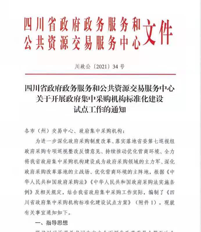 8月3日,四川在线记者从四川省政府政务服务和公共资源交易服务中心(以下简称省中心)获悉,为进一步深化政府采购制度改革,持续推动优化营商环境,四川省即日起启动政府集中采购机构标准化建设试点工作。