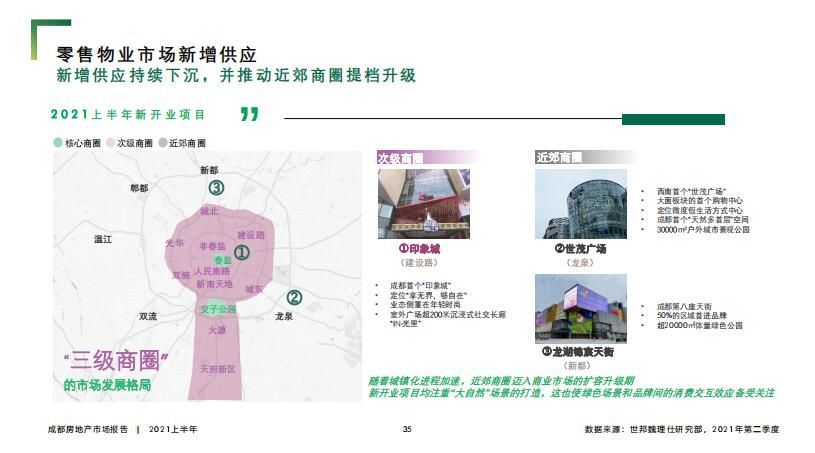 零售物业市场上半年新增供应持续下沉,3个新开业购物中心均落于非核心商圈,合计约29万平方米;其中龙泉的世茂广场和新都的龙湖锦宸天街推动近郊商圈提档升级,且均注重“公园+”场景的打造。