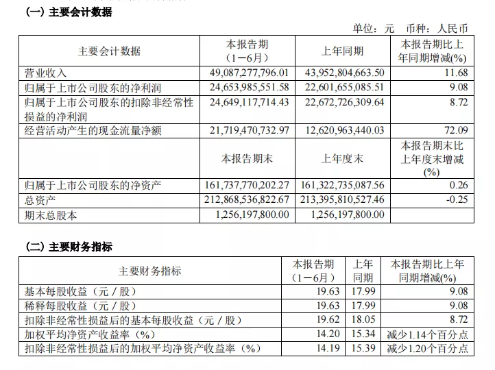 7月30日晚间,贵州茅台(600519,SH)发布上半年财报。财报显示,2021年上半年贵州茅台实现营收490.87亿元,同比增长11.68%;净利润为246.54亿元,同比增长9.08%,相当于日赚2.7亿元;经营活动产生的现金流量净额为217.19亿元,同比增72.09%。不过,茅台上半年11.68%的营收增速仅高于疫情影响下的去年同期数据,低于2016年以来的其他年份,而净利润9.08%的增长幅度则创下了自2016年来的新低。