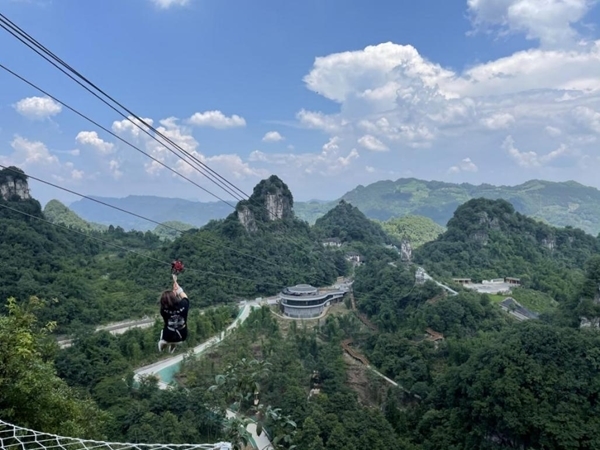 飞拉达的终点就是另一处户外项目——“高空溜索”的起点,一根长达250米,高差36米的铁索横贯空中,挑战者可以乘坐溜索,从高空俯瞰景区的美景。