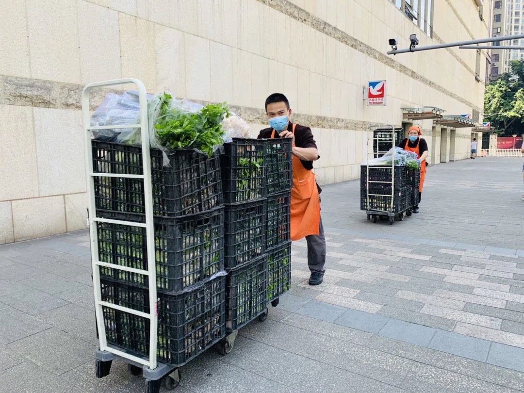 绿叶菜、大西瓜、卤猪蹄......伊藤洋华堂用超市小推车组成了一个爱心送货车队,将封控区居民购买的蔬菜食品等送到小区楼下的取货点。充足的货源,在这特殊时期格外安定人心。为了给封控区居民提供物资,伊藤、麦德龙两家大型超市14天持续营业。