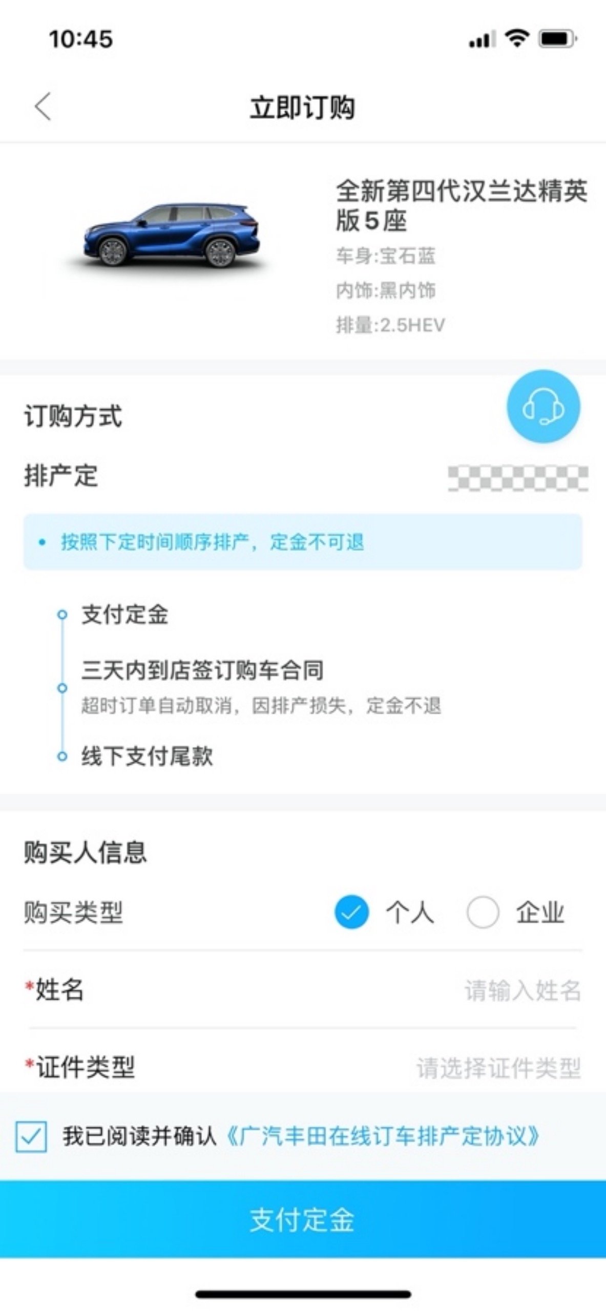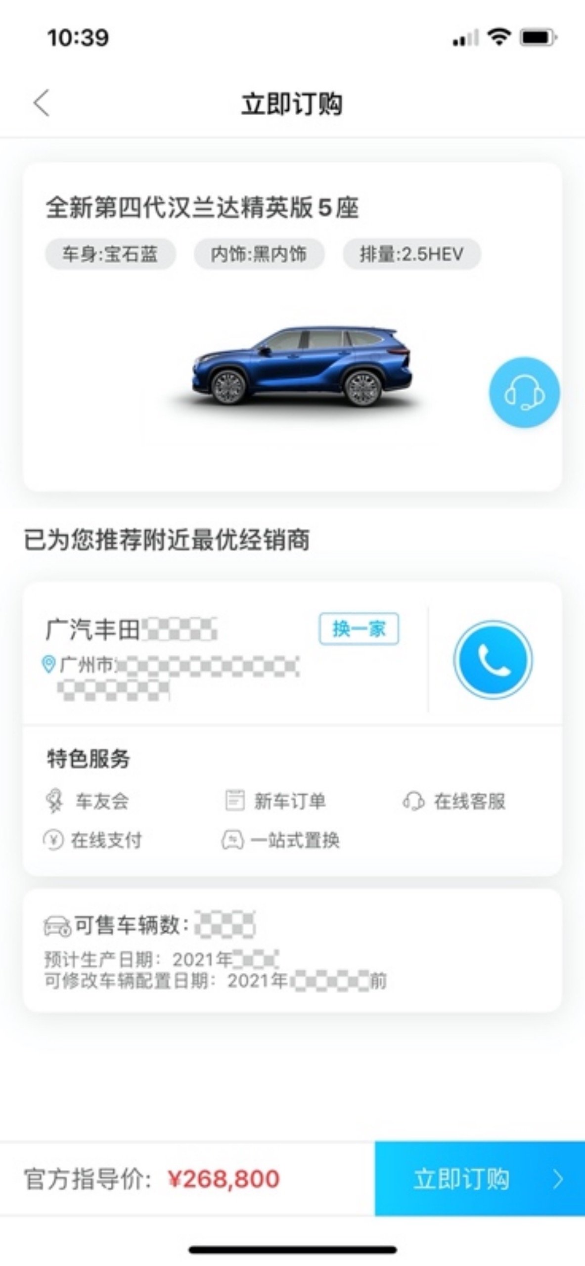 用户登录丰云行App,点击“立即购车”进入页面,选择全新第四代汉兰达车型版本、车身色和内饰颜色;查看各地经销店可售车辆数量以及预计生产日期,选择经销商,即可线上订购。