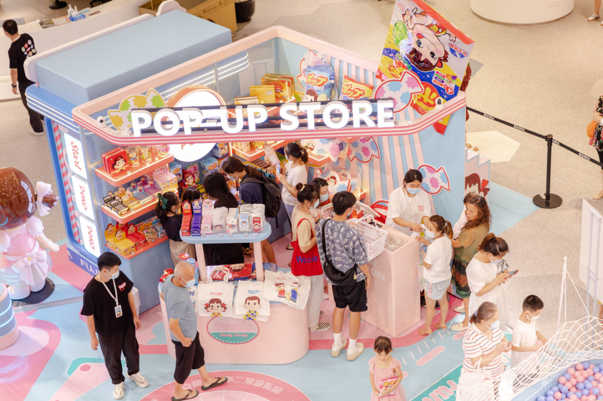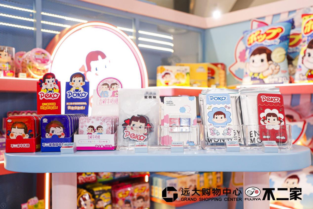 此外,不二家的IP形象打破原本的次元壁,以全新形式入驻现场限时快闪店。“Peko牛奶妹”化身为新学期必备的文件袋和小橡皮,时尚达人喜爱的帆布袋和渔夫帽,以及冷水杯、香薰片、冰箱贴、抱枕、地毯等日常物件。香醇牛奶糖、巧克力夹心糖、棒棒糖等不二家经典产品亦有展示销售,让观众重温童年时光。