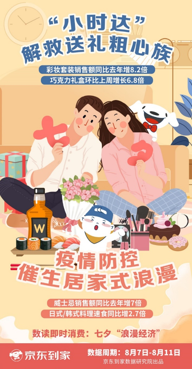京东到家平台数据显示,临近七夕的这一周,礼品类商品销售额同比去年增长了2.2倍,彩妆套装同比增长8.2倍。巧克力礼盒的销售额环比前一周增长了6.8倍。