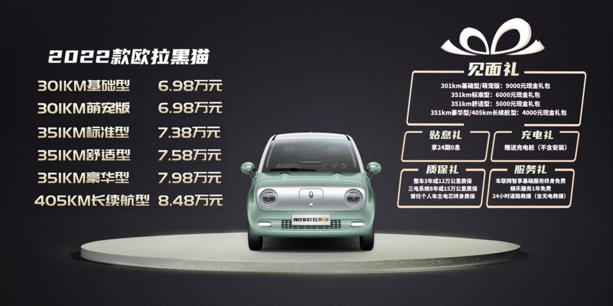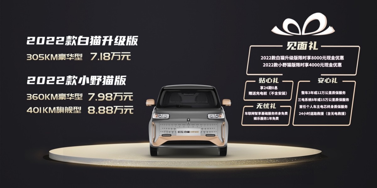 2022款欧拉黑猫拥有全新喵眼式LED大灯、喵系轻奢内饰,更有丰富的色彩选择;17.25英寸智能双联互动大屏、全生命周期FOTA升级、双向行车记录仪;ORA-Enjoyment™舒享模式与宽敞空间珠联璧合;更有全场景智能驾驶辅助系统、360°全场景泊车系统等配置。