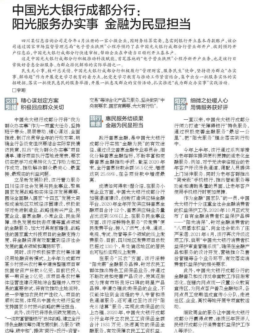 民生无小事,枝叶总关情。中国光大银行成都分行积极履行“管理财富,服务民生”使命,坚持将为群众“办实事、解难题”作为开展党史学习教育的着力点,把党史学习教育与推动工作紧密结合,集中出台一批服务实体的实招硬招,落实一批便民惠民的服务举措,开展一批惠及群众的宣传活动,扎实推进“我为群众办实事”实践活动。□宇珩