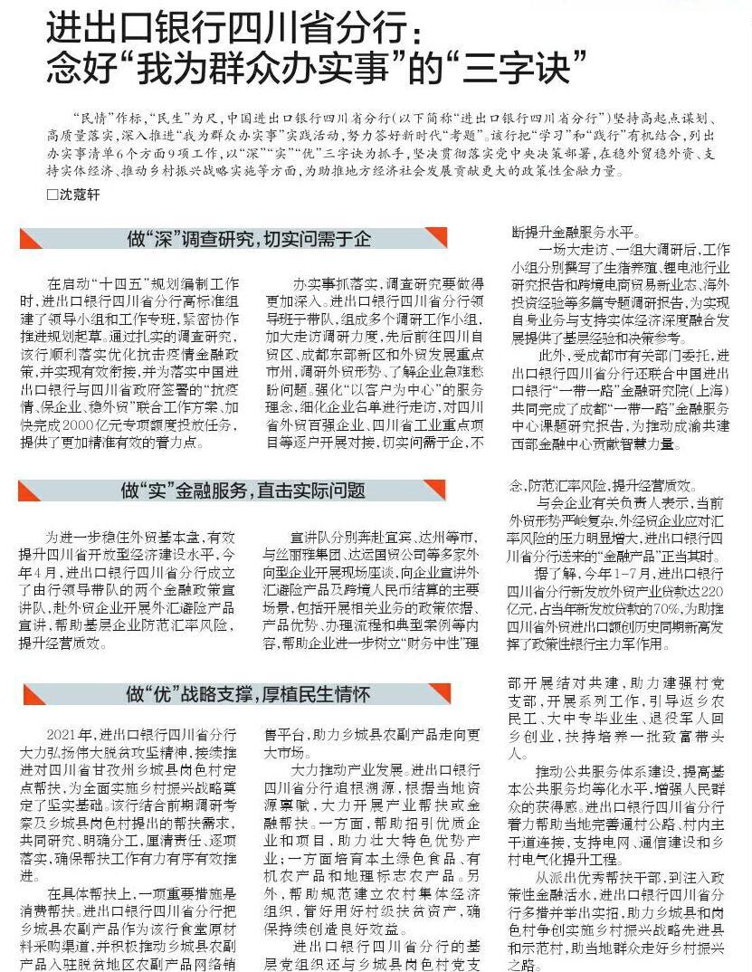 “民情”作标,“民生”为尺,中国进出口银行四川省分行(以下简称“进出口银行四川省分行”)坚持高起点谋划、高质量落实,深入推进“我为群众办实事”实践活动,努力答好新时代“考题”。该行把“学习”和“践行”有机结合,列出办实事清单6个方面9项工作,以“深”“实”“优”三字诀为抓手,坚决贯彻落实党中央决策部署,在稳外贸稳外资、支持实体经济、推动乡村振兴战略实施等方面,为助推地方经济社会发展贡献更大的政策性金融力量。