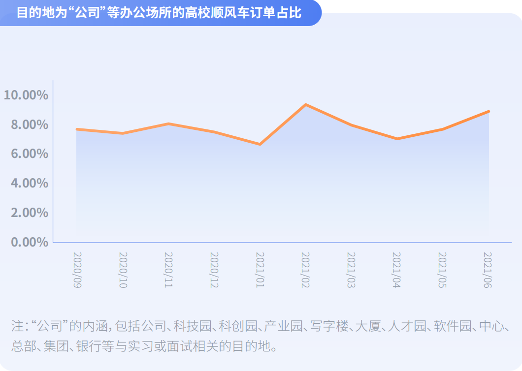 据嘀嗒顺风车大数据的一处有趣发现,寒暑假期间,虽然高校顺风车订单总量处于低谷,但前往“公司”等相关办公场所的订单占比却处于最高值,2月份和6月份分别为9.3%、8.8%。这表明,不少高校学子都在利用寒暑假,前往各工作单位实习,一定程度体现了当代大学生以自我成长为驱动力的“新拼搏”精神。