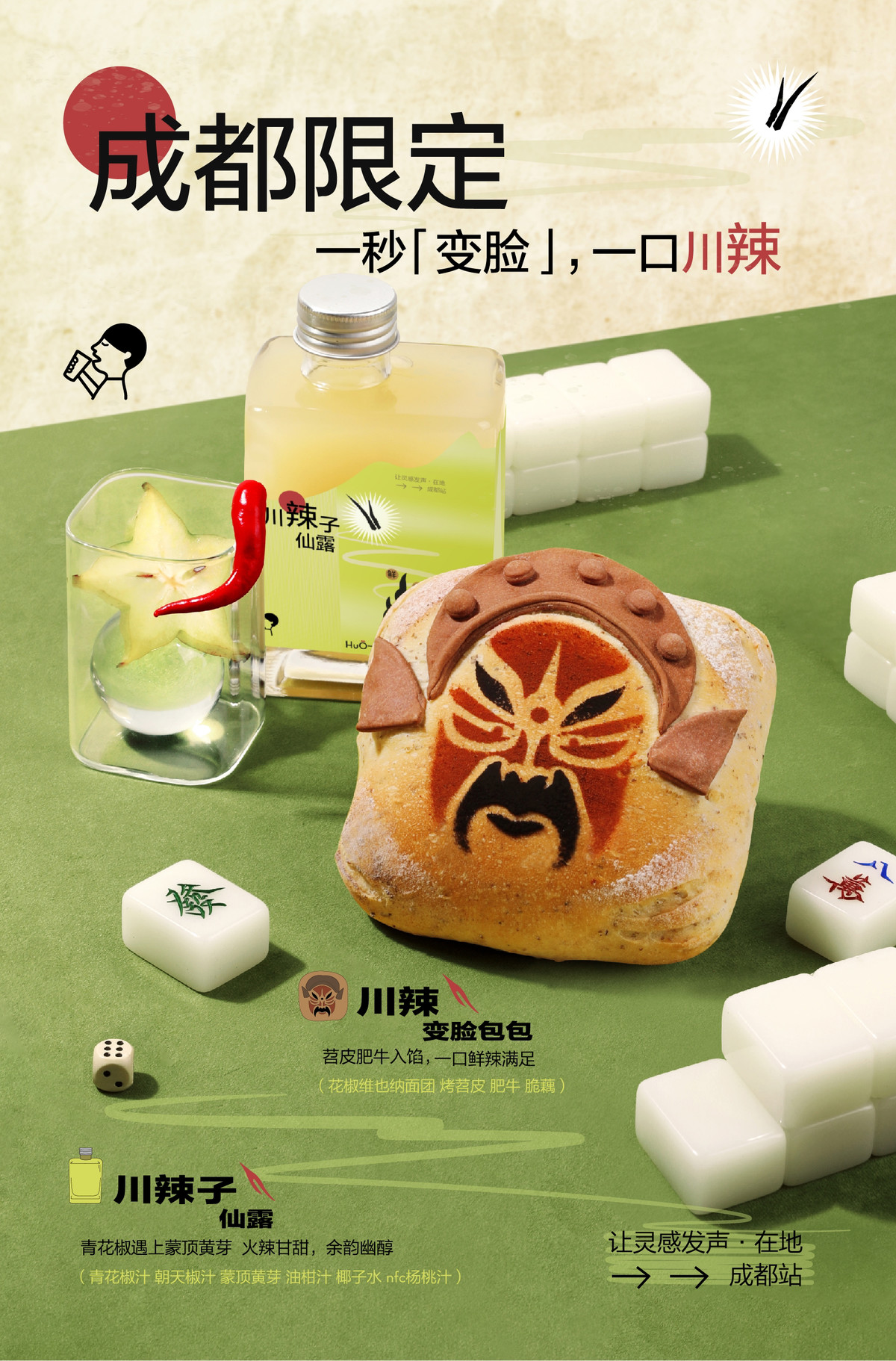 此外,喜茶还推出了一款全新的城市限定热麦产品——川辣变脸包包。这款产品以川剧变脸为灵感来源,融合成都川味火锅的概念,加入了火锅必备的食材牛肉、藕片。并加入四川经典食材花椒,使用川剧脸谱进行表面装饰,为成都消费者带来了全新的味觉体验。据悉,这也是喜茶在成都推出担担面包、麻婆豆腐包等城市限定热麦产品后,再次在成都推出的全新限定热麦产品。