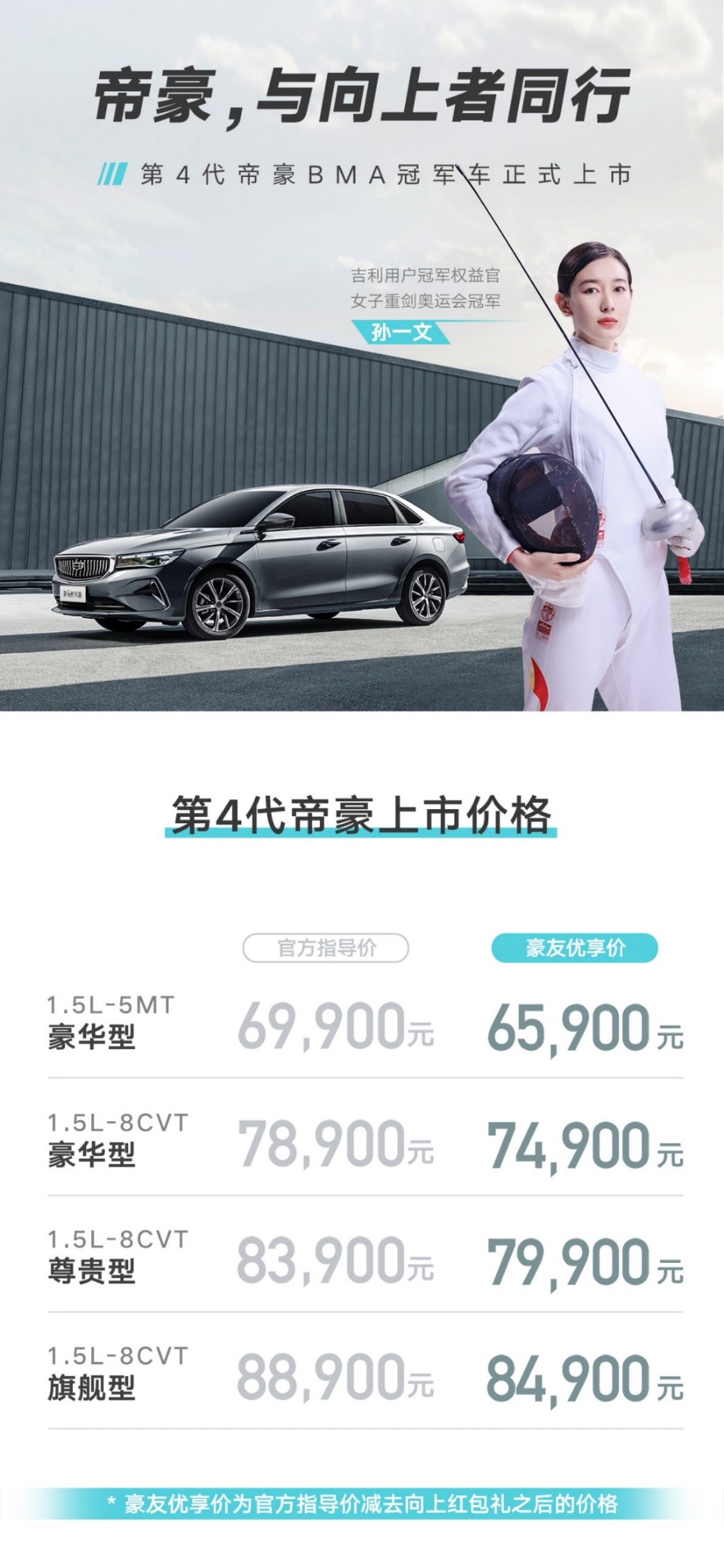 8月28日,吉利汽车第4代帝豪正式上市,推出1.5L-5MT和1.5L-8CVT两种动力组合共4款车型,官方指导价为6.99-8.89万元(享受向上红包礼后6.59万-8.49万元)。与此同时,吉利官方还推出五大无忧购车福利。