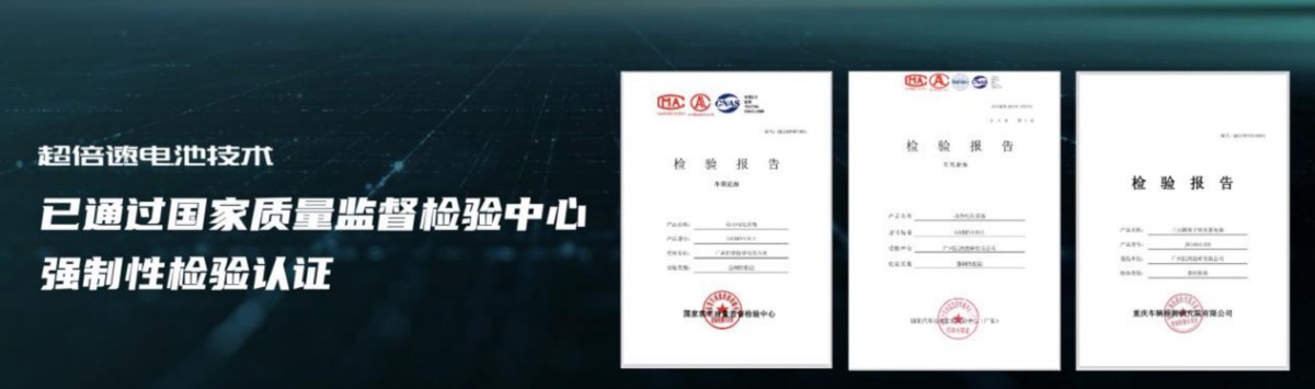 目前,广汽埃安超倍速电池技术已经通过国家质量监督检测中心的强制性检验认证,并将陆续搭载于AION 家族系列车型。