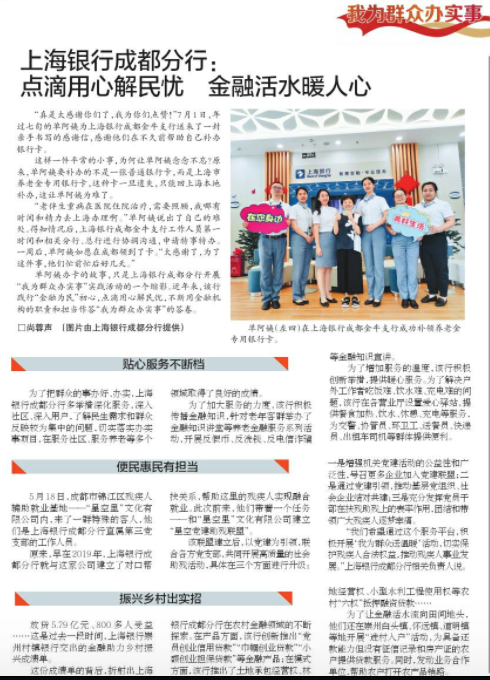 单阿姨办卡的故事,只是上海银行成都分行开展“我为群众办实事”实践活动的一个缩影。近年来,该行践行“金融为民”初心,点滴用心解民忧,不断用金融机构的职责和担当作答“我为群众办实事”的答卷。
