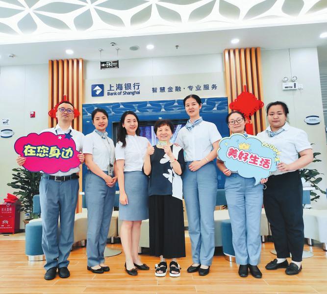 单阿姨(左四)在上海银行成都金牛支行成功补领养老金专用银行卡