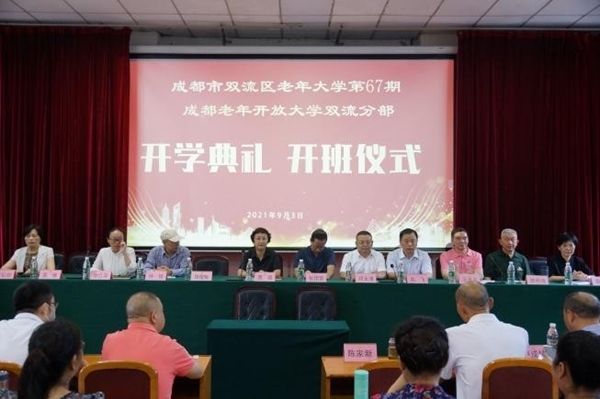 为贯彻落实市委市政府《关于实施幸福美好生活十大工程的意见》全龄友好包容社会营建工程中“大力发展城乡社区老年教育”要求,践行《成都市双流区社区教育与老年教育工作融合发展实施意见(实行)》,2021年 9月 3日,双流区社区教育与老年教育融合发展研讨会暨成都老年开放大学双流分 部开班仪式、成都市双流区老年大学第 67 期开学典礼在双流区老年大学礼堂隆重举行。