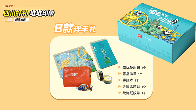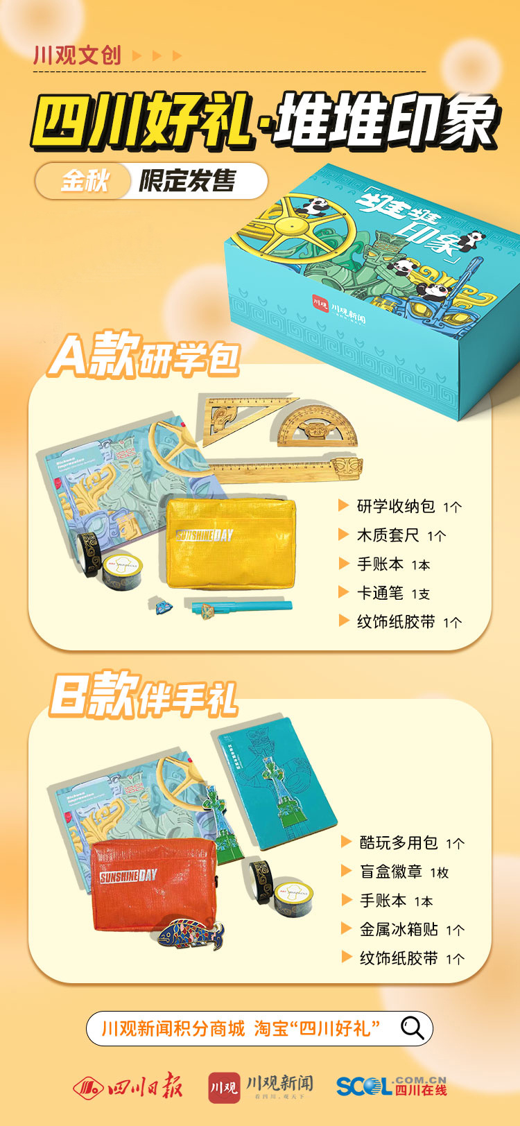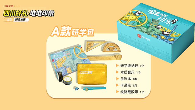 33800积分即可兑换“川观文创”四川好礼·堆堆印象一盒。研学包、伴手礼,两款可选。四川在线的积分壕客们,瞅准喜欢的就下手吧。