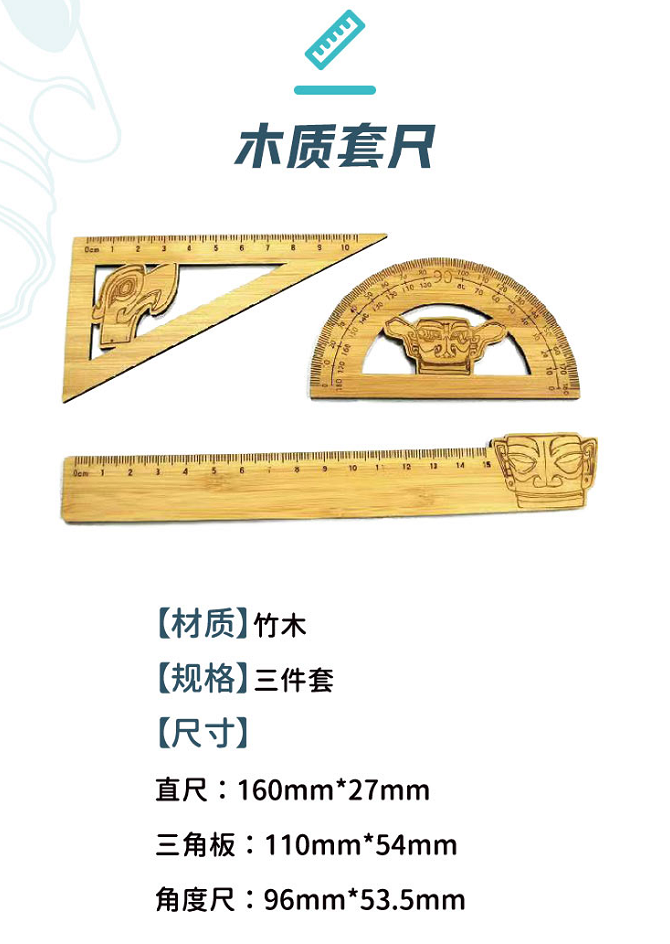 木质套尺,印有大耳朵金面具纹样,学习工具可可爱爱。