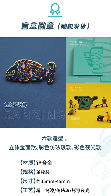 盲盒徽章,纵目面具、鱼形纹饰,缘分定制。
